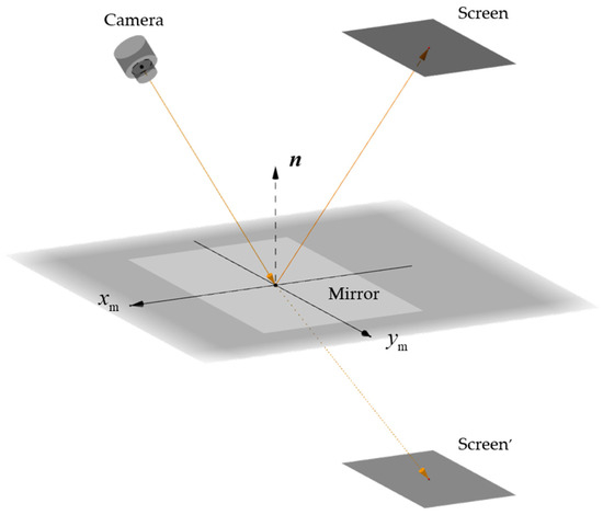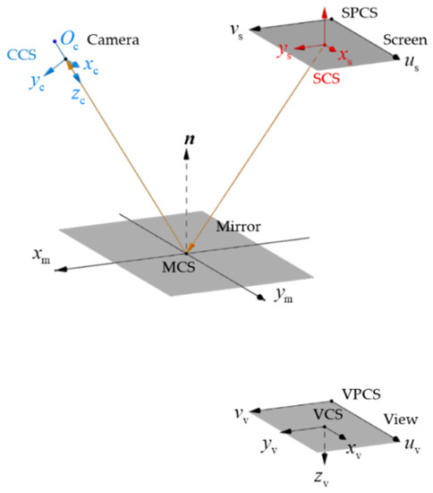 Coordinate transformations are necessary for this work to construct the SPG model. There are four physical coordinate systems introduced in this measuring system model, which are demonstrated in Figure 2. They include the Screen Coordinate System (SCS), View Coordinate System (VCS), Camera Coordinate System (CCS), and Mirror Coordinate System (MCS). In this work, the World Coordinate System (WCS) is MCS, and VCS is the mirror coordinate system of SCS. Both the coordinate transformation between MCS and CCS and the coordinate transformation between VCS and CCS are determined by an improved camera calibration [21]. The camera calibration requires the camera to observe a planar checkboard from a few different orientations. To figure out the transformation between MCS and CCS, a planar checkboard is placed on the reference mirror plane, and the image of the checkboard is captured. A virtual planar checkboard image that is the same as the planar checkboard is displayed on the screen, and a flat mirror without markers is introduced to establish the relation between VCS and CCS. Note that the lens is fixed when the camera is calibrated. A camera-calibration algorithm is then introduced to estimate the camera parameters. The camera parameters involve intrinsic parameters, distortion coefficients, and extrinsic parameters. The rotation matrices and translation vectors among coordinate systems are involved in the extrinsic parameters. The transformation relation between SCS and CCS can be built by the mirroring relationship between VCS and SCS, and it can be denoted as