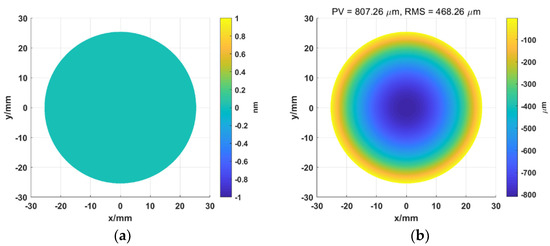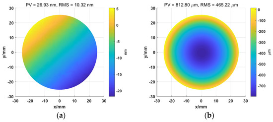The residual maps between mathematic models and reconstructed shapes of mirrors are shown in Figure 7. As the reference shape of the planar mirror is the xOy plane in MCS, the residual map is the same as the reconstructed planar mirror’s shape. For the concave mirror, the mean error is μm, and the RMS value of error is 17.39 μm.