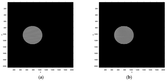 One of the simulated fringe patterns in camera view for planar mirror and concave mirror. (a) The deformed horizontal fringe pattern image simulated for planar mirror. The resolution is 2048 × 2048 pixels; the sinusoidal fringe initial phase is 0, and the period is 8 screen pixels. (b) The deformed horizontal fringe pattern simulated for the 200 mm-focus concave mirror; its initial phase is 0, and the period of fringe patterns is 8 pixels.