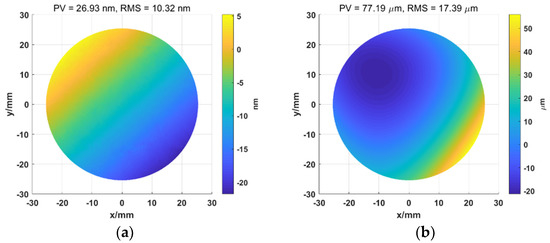 The residual map between the reference model and the reconstructed model of mirrors. (a) The residual map of the planar mirror; the RMS of error is 10.32 nm. (b) The residual map of the concave mirror; the RMS value of error is 17.39 μm.