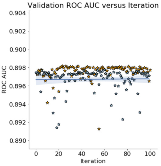 BO has emerged recently as one of the most promising optimisation methods for expensive blackbox functions. It has gained a lot of traction in the HPO community, with significant results in areas such as image classification, speech recognition, and neural language modelling. For an in-depth preview of BO, the reader is referred to [17,29]. BO is an informed method that takes into consideration past results to find the best hyper-parameters. It uses those previous results to form a probabilistic model that is based on a probability of the score given a vector of hyper-parameters. This is denoted by the formula: . Reference [30] refers to the probabilistic model as a surrogate for the objective function denoted by , the probability of y given x. The model or surrogate is more straightforward to optimise than the objective function. BO works to find the next hyper-parameters to be evaluated using the actual objective function by selecting the best-performing hyper-parameters on the surrogate function. A five-step process to do this is given by [30]. The first step builds a surrogate probability model of the objective function. The second finds the hyper-parameters with the best results on the surrogate. The third applies those values to the real objective function. The fourth updates the surrogate using this new real objective function result. Steps 2–4 are repeated until the maximum iteration or budgeted time is reached [31]. BO has two primary components: a probabilistic model and an acquisition function to decide the next place to evaluate. Furthermore, BO trades off exploration and exploitation; instead of assessing the costly blackbox function, the acquisition function is cheaply computed and optimised. There are many choices for the acquisition function, but here, we use the most common—expected improvement (EI) [32]. The goal of Bayesian reasoning is to become more accurate as more performance data is acquired. The previous five-step processes are repeated to keep the surrogate model updated after each evaluation of the objective function [15]. BO spends a little more time generating sets of hyper-parameter choices that are likely to provide real improvements whilst keeping calls to the actual objective function as low as possible. Practically, the time spent on choosing the next hyper-parameters to evaluate is often trivial compared to the time spent on the (real) objective function evaluation. BO can find better hyper-parameters than Random Search in fewer iterations [27]. In this paper, we investigate whether AHBO-TPE, a specific variant of BO, can, for Windows PE file malware detection purposes, find better hyper-parameters than Random Search and with fewer iterations.