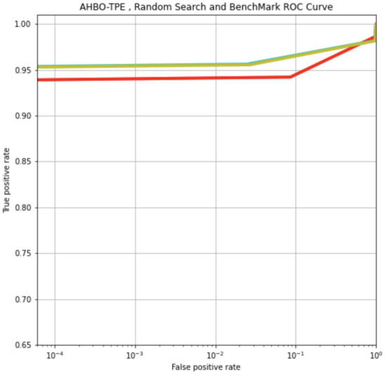 ROC AUC Comparison for AHBO-TPE (Cyan), Random Search (Yellow), and Default Benchmark Model (Red) applied to the Ember Dataset.