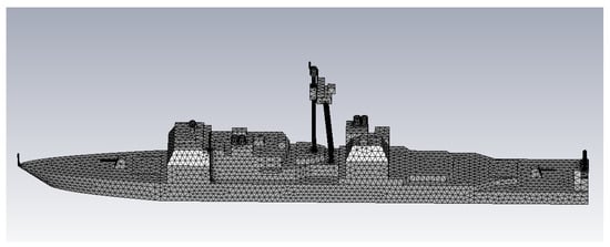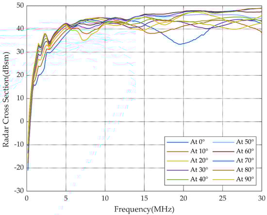A large complex ship was selected as the object of the radar target, and the main size was 153 m × 15 m. The experimental process is divided into three modules: the first involves creating an accurate model of the ship based on computer simulation technology microwave studio (CST MWS), as shown in Figure 2, the hexahedral meshing model of the destroyer is given. Second, the target echo data were obtained, and the calculation range of the frequency response ranged from 0.15 MHz to 30 MHz, 200 samples with a frequency step of 0.15 MHz. Accordingly, the radar echo scattering data were calculated in ten directions from 0° to 90° at 10° intervals. Figure 3 shows the scattering data of the ship in different azimuths. Third, this method was used to extract the pole features of the ship, and the extracted target poles were all normalized by ( is the length of the ship).