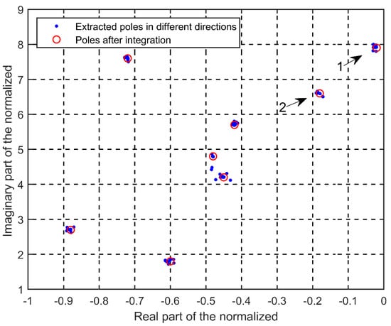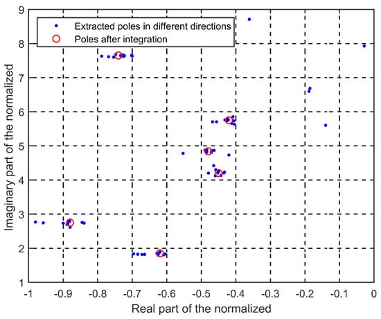 Figure 4 shows the pole results based on the matrix beam method. Figure 5 shows the extracted poles distribution of the ship in ten directions using the method described in this study. Compared with Figure 4 and Figure 5, it is obvious that the method presented herein has two advantages. In Figure 5, the pole locations extracted from different directions are more tightly grouped, which shows that the poles extracted by this method are true poles and exhibit a more distinct aggregation pattern than the poles in Figure 4. This indicates that the poles extraction method in this study has been greatly improved in precision. This is because the matrix beam method only intercepts the late response of the echo data for processing. It can neither avoid the aliasing influence of the early-and late-time responses, nor eliminate the truncation error caused by the late response, thus resulting in large deviations of the poles in different azimuths. Conversely, the poles extraction method proposed in this study was combined with the early-and late-time responses for approximation purposes. Thus, these two defects were overcome, and more efficient and accurate results can be obtained. Moreover, as shown in Figure 5, there are two more poles (poles 1 and 2) compared with those in Figure 4, which demonstrates that the poles extracted by this method are more comprehensive. The omission of true poles in the literature largely lies in the fact that the selected value of the parameters of poles in the matrix beam method is not accurate enough. The method in this study combines the model orders of the system with the specific particle swarm optimization algorithm, and the parameters are greatly optimized, which solves the error problem caused by parameter dependence and avoids the omission of true poles.