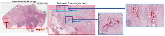 Perineural invasion (PNI), an important pathological feature of many malignancies, is the attachment of tumor cells to nerves [1,2,3]. In many cancers, the detection of PNI indicates a high risk of local recurrence and reduced survival [4,5]. The diagnostic criterion for the pathological diagnosis of PNI is cancer surrounding at least 33% of the nerve, which is detected by pathologists in microscopic examinations of tissue specimens [6,7]. The detection of PNI in small nerves on glass slides is a labor-intensive task [8]. Moreover, because tumor cells exhibit different morphologies depending on histological types and organs, and the infiltrating patterns of tumor cells are highly variable, it is difficult to model cancer in all organs [9,10].