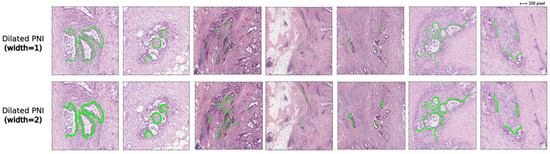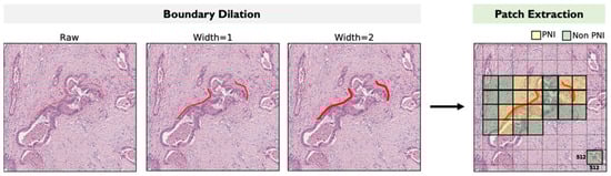 The proposed boundary dilation method is conceptually illustrated in Figure 2. The raw one-pixel boundary line expands to the left and right by a variable width factor. For example, if the width is set to 1, the one-pixel raw boundary will expand by 1 pixel in both the left and the right directions. Similarly, if the dilation width is set to 2, the one-pixel raw boundary will expand two pixels to the left and two pixels to the right, on the basis of the raw boundary pixel. We then split the whole WSI image into smaller patches for efficient model training. Around the dilated PNI annotations, a sliding window scheme with 50% overlap is used to extract patches for PNI and non-PNI of size (512 × 512). Consequently, there are two classes of extracted patches: PNI containing both nerves and tumors, and the remaining non-PNI.