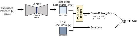 The segmentation masks for the PNI regions were obtained by U-Net [19]. U-Net is a U-shaped architecture consisting of a contracting path as the encoder and an expansive path as the decoder. EfficientNet-b2 [23] was adopted as the encoder of U-Net with pretrained ImageNet [24] weights for faster and better convergence. The contracting path maps the input to a context vector, and the expansive path yields a high-resolution segmentation map from the context vector. The output segmentation map represents the location of the PNI on a given input patch and indicates whether the input patch contains PNI. Because the segmentation map consists of binarized PNI pixels of 1 and non-PNI pixels of 0, the existence of PNI in the input patch can be determined by the maximum value of the segmentation map. That is, if the segmentation map contains a pixel value of 1, this patch includes PNI, and this patch is classified as a PNI class. If the segmentation map does not have a pixel value of 1, the patch does not contain PNI. To improve PNI detection performance, the combined loss function proposed in this study is expressed as the sum of Dice and cross-entropy losses. The Dice coefficient, a loss function of PNI segmentation, measures the similarity between the predicted segmentation map and the ground-truth boundary region map. By applying the global max pooling layer to the output segmentation map, the cross-entropy loss between the maximum value of the predicted segmentation map and the ground truth is calculated such that the cross-entropy measures the difference between the predicted class and the ground-truth class. This combined loss allows our method to simultaneously perform PNI detection and segmentation, which helps improve individual performances by providing more information between the segmentation and ground-truth maps (Figure 4).