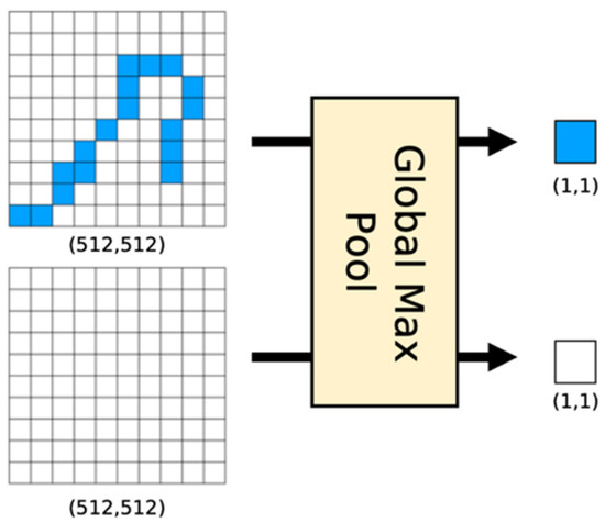 Specifically, the input patches are labeled with either 0 or 1 by the global max pooling of the pixel labels. If there exists at least one pixel labeled as boundary pixel, the patch is labeled with 1. Otherwise, it is labeled with 0. This can be achieved by two-dimensional global max pooling. The pixel values are 0 or 1; thus, the global max pooling value of all patch pixels is 1 if there exists at least one boundary pixel, as shown in Figure 5. The boundary lines are dilated by a given factor. As shown in Figure 6, the original ground-truth lines are expanded in four directions (up/down/left/right), and the boundary area is expanded. The dilated region is then used as segmentation maps for the U-Net in Figure 4.