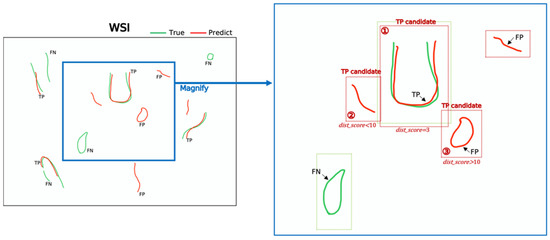The predicted line with the lowest among the candidate lines, having less than the maximum tolerated distance score of 10, was determined to be clinically significant and considered as true positive (TP). The remaining candidate lines with a of less than 10 were excluded from the false positive (FP) count. In cases where the of a candidate line was larger than the tolerated value, the predicted line was discarded, and the ground-truth line was left unmatched (false negative, FN). Finally, the F1-score was computed based on the matching information, i.e., matched ground-truth lines (TP), unmatched ground-truth lines (FN), and unmatched predicted lines (FP). Figure 7 shows how the matching information is calculated from the evaluation metric. One WSI has multiple PNI lines, and, at the WSI level, the F1-score is calculated using matching information for each WSI.