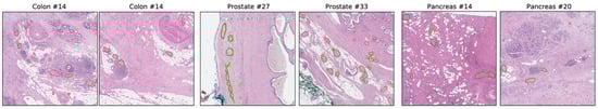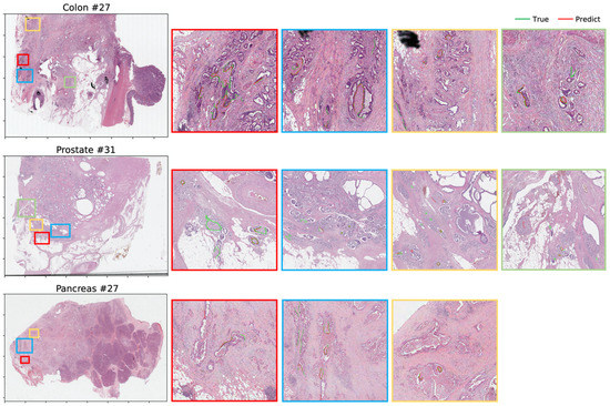 Examples of PNI predictions for different cancer types are shown in Figure 8. The lines colored in green are annotations made by pathologists, and the lines colored in red are the prediction results from our method that achieved the best F1-score. Overlap of the green and red lines indicates that the PNI was found correctly (matched ground truth; TP). The presence of only a green line indicates that the PNI was not found (unmatched ground truth; FN), and the presence of only a red line indicates that the PNI was predicted incorrectly (unmatched prediction; FP). We also identified different morphologies of tumor cells in different organs. These F1-scores may appear underwhelming in comparison to those for other detection tasks. However, given the difficulty of the PNI detection task, our result is comparable to that of ranked teams in the 2021 competition [20], even using only PNI annotations.