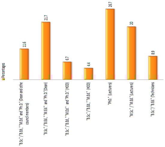 Table 1 below gives a summary of the educational qualifications of the administrators and respondents from the different universities used in the study. It can be observed from the table that, out of the 180 respondents, all of the administrators were graduates with relevant qualifications, which offered them the privilege of impacting students and being able to effectively utilize e-learning strategies in teaching students. The lecturers had all obtained degrees, from B.Sc./B.Ed. degrees held by 16 (8.9%) lecturers to Ph.D. degrees held by 48 (26.7%) lecturers. Additionally, the heads of departments (HOD) who responded had a frequency of 8 (4.4%) and 12 (6.7%), and the deans of different faculties that engaged in the study had frequencies of 39 (21.7%) and 21 (11.6%) for B.Ed., PGD and Ph.D. degrees, educational background of the administrators are shown in Figure 1 below.