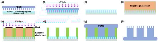 Figure 1 shows the fabrication process of the polydimethylsiloxane (PDMS) hierarchical structures using photolithography and the micromolding process. First, the PDMS secondary structures with micropillar arrays were fabricated using the conventional exposure, development, and molding process, as shown in Figure S1. The thicknesses of the fabricated PDMS secondary structures were 7 μm. Second, the secondary structure templates with microhole arrays were fabricated by negatively duplicating the PDMS secondary structures using UV imprinting lithography, as shown in Figure 1a–c. A NOA71 UV-cured polymer with fast curing and long-term stability over a wide temperature range was chosen as the imprinted material. It was spin-coated on the glass slide with a speed of 1000 rpm for 60 s, and the PDMS secondary structure template was pressed onto this slide (Figure 1a). Following this, the whole wafer was cured under UV light with a wavelength of 350 nm for 10 min (Figure 1b). After demolding, the corresponding UV-cured polymer microholes were obtained as the secondary structure template (Figure 1c). Third, taking the UV-cured polymer microhole template as the substrate, the PDMS hierarchical structures were fabricated by the second exposure, development, and molding process, as shown in Figure 1d–h. A SU8-2050 negative photoresist was spun on the substrate containing the UV-cured polymer microhole array at 1600 rpm for 35 s, followed by a two-step soft baking for 7 min at 65 °C and 12 min at 95 °C. Then, a 70 μm thick photoresist film was produced (Figure 1d). A lithographic mask was pressed against the film, and a UV light was passed through this mask from the top side for 14 s (Figure 1e). Subsequently, the wafer was developed in a solution of propylene glycol monomethyl ether acetate (PGMEA) and rinsed in isopropanol (IPA) to dissolve the unexposed photoresist. Then the hierarchical microhole array was formed in the photoresist film as a mold (Figure 1f). PDMS with good replication capability and low cost was used as a filling material to duplicate the structures from the mold. It was mixed with pre-polymer PDMS and curing agent at a mass ratio of 10:1 and degassed for 10 min under vacuum. Then the photoresist mold was filled with the PDMS solution by spin coating process at 1500 rpm for 40 s, followed by putting in vacuum for 30 min to degas air in the structures (Figure 1g). Following this, the PDMS was cured for 2 h at 85 °C and demolding from the photoresist mold to obtain the PDMS hierarchical structure (Figure 1h). The thicknesses of the fabricated PDMS hierarchical structures were 70 μm. In the fabrication process of the hierarchical structures, the diameters and center distances of the secondary and primary micropillars could be controlled accurately and conveniently by regulating the masks’ sizes. Therefore, the hierarchical structures could be well-controlled and scalable manufacturing, taking advantage of the high accuracy, large area, and high consistency of the used lithography and nanoimprinting technology.