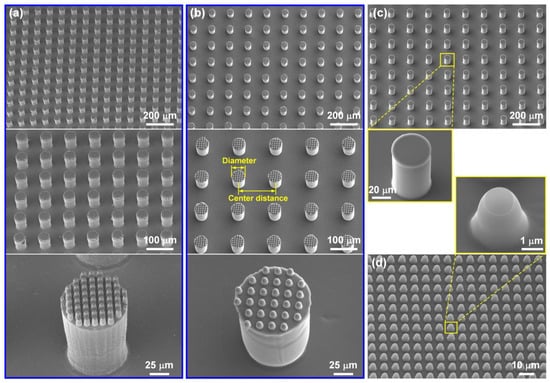 SEM observed the morphologies of the hierarchical structures under different magnification levels. Figure 2a,b shows the SEM images of the PDMS hierarchical structures I-100-II-6 and I-150-II-9 (I represents the center distance of primary micropillars and II represents the center distance of secondary micropillars). It can be seen that in these two samples, the diameters of the primary and secondary micropillars were both 50 μm and 3 μm, while the center distances of the primary and secondary micropillars increased from 100 μm to 150 μm and 6 μm to 9 μm, respectively. For comparison, the individual primary structures were prepared when the UV-cured polymer microhole template substrate in Figure 1d was replaced by a flat glass slide. Figure 2c presents the morphology of the PDMS film I-150, which is only equipped with the primary micropillar array with a diameter of 50 μm and a center distance of 150 μm. During the fabrication process of the hierarchical structures, when just the first step, as shown in Figure S1, was conducted, the individual secondary structures were obtained. Figure 2d gives the SEM images of the PDMS film II-9, which owned the single secondary micropillar pattern with a diameter of 3 μm and center distance of 9 μm. These SEM images indicated the photolithography and micromolding process was an effective method to realize the controllable and scalable fabrication of the hierarchical structures. The fabricated two-level micropillars exhibited high accuracy and good consistency.