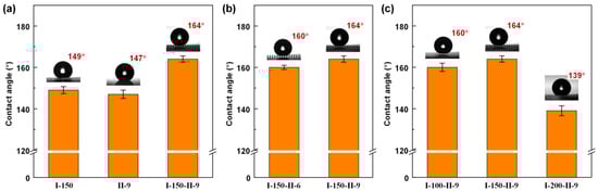Contact angles of different PDMS films: (a) single primary structure I-150, single secondary structure II-9, and corresponding hierarchical structure I-150-II-9, (b) hierarchical structures with different secondary micropillar center distances, (c) hierarchical structures with different primary micropillar center distances.