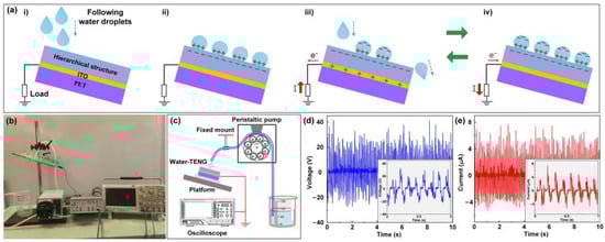 Figure 4a presents the energy harvesting mechanism of the hierarchical structures-based water-TENGs. When the water droplets dripped onto the hierarchical structures (Figure 4(ai)), the contact electrification between water and PDMS would occur, and triboelectricity would be generated. According to the triboelectric series [], the PDMS surface is highly electronegative, so charges would transfer from water to the PDMS films, making the PDMS hierarchical structures negatively charged and the droplets positively charged (Figure 4(aii)). When sufficient friction between water and PDMS took place, the PDMS surface would be accumulated a large number of negative charges. During the subsequent impact of the flowing water droplets, the contact area between water and the negatively charged hierarchical surface was dynamically varied, which would motivate an electrostatic induction and finally contribute to the triboelectric output. As shown in Figure 4(aiii), when fewer water droplets were in contact with the PDMS surface, some negative charges on the PDMS surface were compensated for by the attracted cations on the water surface, while others would drive electrons to flow from the bottom electrode to ground until reaching equilibrium. When the contact area between the flowing water and the hierarchical structure continued to increase, as shown in Figure 4(aiv), the negative charges on the PDMS surface were purely compensated for by the cations of the water droplets. Electrons were attracted from the ground to the bottom electrode to neutralize the excessive positive charges on the bottom electrode. If water was dripped at a constant flow velocity, the contact area between water and PDMS would periodically decrease and increase. Then a loop from Figure 4(aiii) to Figure 4(aiv) would be induced, and an alternating electron flow in the external load would be observed.