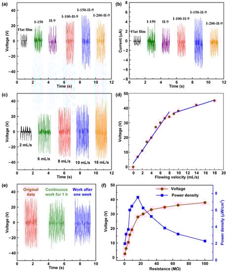 Furthermore, the effect of the flowing velocity on the output performance was also analyzed. Figure 5c shows the output voltage of the hierarchical structure I-150-II-9-based water-TENG at the flowing velocities between 2 mL/s and 18 mL/s. And Figure 5d fits the relationship between output voltage and flowing velocity of the hierarchical structure I-150-II-9-based water-TENG. It can be seen that as the flowing velocity increased from 0 mL/s to ~8 mL/s, the output voltage increased remarkably. The reason was suggested to be that the increase of the flowing velocity would induce more triboelectricity in the hierarchical surface. The charge density increase in the triboelectric layer would contribute to higher output. When the flowing velocity continued to increase from ~8 mL/s to 18 mL/s, the slope of the fitting curve decreased, and the output voltage tended to saturate. When the flowing velocity increased to a certain degree, the contact between the hierarchical structure and the water was sufficient, and the induced triboelectricity became saturated, resulting in the decline in the increasing tendency. Meanwhile, it was found that the output frequency also increased with the flowing velocity. The increase of the flowing velocity would accelerate the contacting and leaving process of water and the hierarchical structure, motivating the faster charging and discharging speed. These results endowed the hierarchical structures-based water-TENGs with the potential to apply to a self-powered sensor for measuring the flow velocity within a certain range. In addition, the hitting angle of the water droplets is also an important factor that affects the triboelectric output. Mariello et al. have reported that as the inclination angle of the TENG plane with respect to the water flow direction increased from 0° to 90°, the output voltage increased []. When the hitting angle of the flowing water increased, more kinetic energy from the impact of the flowing water would be transferred to the water-TENG, resulting in a larger degree of contact electrification and a higher triboelectric output. The cycle stability and device stability were also studied. As shown in Figure 5e, no obvious degradation of the output voltage was measured after continuous work for 1 h. It even maintained high performance when the test was conducted again after the device was placed for one week in the open environment. These results indicated that the water-TENG device had excellent durability and could be used for long-term practical purposes.
