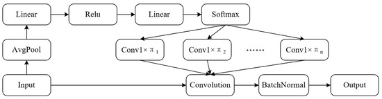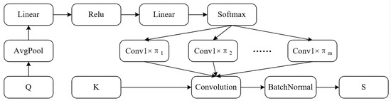 Dynamic convolution aims to dynamically aggregate multiple parallel convolution kernels, without increasing the depth and width of the network. It adaptively selects different convolution parameters according to the different input characteristics. Finally, it again convolutes the fused features. Figure 1 describes the calculation process of dynamic convolution. It is assumed that m convolution kernels, i.e., , are used for convolution. The input features will extract the local features through the average pooling layer and the linear layer. Then, the weight of m convolution kernels is computed (i.e., convolution kernel attention) , at the current time step is obtained. Its properties are as follows.