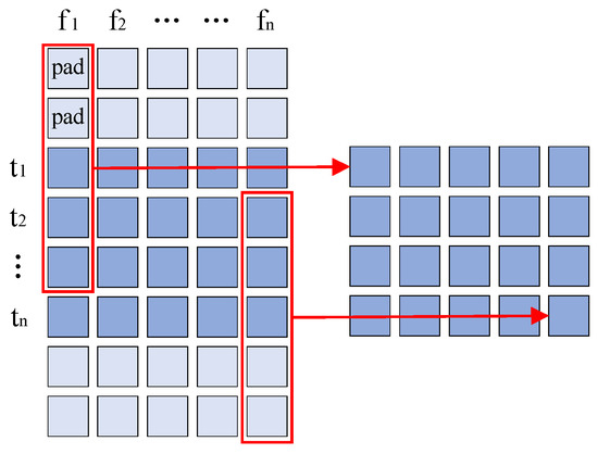 The convolution kernel size and pooling kernel size in DY-CNNs are dynamically determined by the context information length. For obtaining speech feature information of the nth time step context d in matrix . In the X matrix, calculate the convolution of the internal characteristics whose range is . The convolution kernel size is (2d + 1, 1). The convolution kernel size is also the average pooling kernel size when obtaining the attention of the convolution kernel. The path of the corresponding operation process should also be consistent in the convolution and pooling. As shown in Figure 2, the process of pooling and convolution is carried out when the context range d is 2 and the convolution kernel size is (2d + 1, 1).