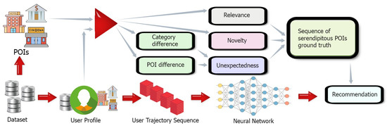 Definition 5 (Serendipity). Serendipity, the most firmly related idea to unexpected quality, includes a positive, passionate reaction of the user about a formerly obscure (novel) suggestion, and serendipitous suggestions are by definition likewise novel [23]. According to the most usual definition, serendipity consists of three elements: relevance, novelty, and unexpectedness. Definition 6 (Trip Relevance). We regard a trip tp as relevant to a user u if she/he has visited most of the recommended POIs o in the recorded history. Therefore, we define the trip tp relevance as:where is the group of users who have visited POIs. For the representation of the relevance, we indicate the relevance of tp to u as . Definition 7 (Trip Novelty). We regard a trip tp as novel to a user u if she/he has visited most of the recommended POIs o in previous recorded history. Therefore, we define the trip novelty as:where is the group of users who have visited POIs. For the representation of the relevance, we indicate the novelty of to u as . Definition 8 (Trip Unexpectedness). We denote a trip tp as unforeseen to a user if it is not comparative from the user profile . Many examinations [24,25,26] think about class as one of key credits of contrast assessment. Moreover, even though two POIs and have a place with a similar classification, there is likewise a distinction between them. In this manner, we incorporate classification similarities and outing similarities to introduce a fine-grained meaning of incredible trip quality as:where [0, 1] is a compromise constraint between the classification distinction and POI contrast components. Definition 9 (Trip Serendipity). We personify the relevance as prediction accuracy and the unexpectedness as the difference from the user profile. Then, at that point, we see a trip as serendipitous to a user, assuming it is both suitable and unforeseen. Thus, we characterize the serendipitous trip as:where [0, 1] is a compromise limit between the pertinence and unexpected parts. We demonstrate the serendipitous trip tp to u as . 3.2. Problem Formulation