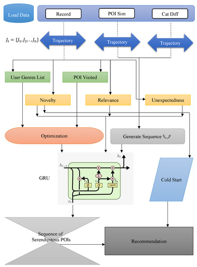 u; (f) Optimization: it enhances the user’s genres list and POI novelty utilizing an Adam streamlining optimizer; (g) GRU Network: it will receive data related to optimization, generated sequence, relevance, novelty, and unexpectedness from the GRU network to obtain a serendipitous trip