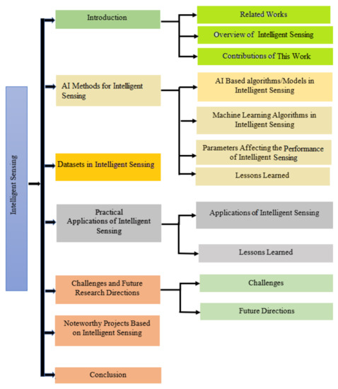 The paper is structured as follows. In Section 2, an overview of recent learning models based on AI and used for intelligent sensing applications is presented. Key parameters that affect the performance of intelligent sensing are also discussed. Section 3 describes the datasets used for intelligent sensing. Section 4 focuses on the numerous applications of intelligent sensing and also presents lessons learned in relation to AI techniques. The key challenges and future research opportunities are presented in Section 5. Several ongoing research projects based on AI technologies and intelligent sensing are summarized in Section 6. Finally, Section 7 concludes the paper. Figure 1 illustrates the structure of the paper.