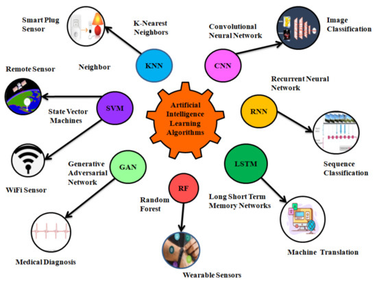 In this section, several approaches based on AI are reviewed that can analyze the complex characteristics of sensor data for various applications. Most of the ML and DL-based algorithms work with numerous types of sensory data that come from different sources. However, algorithms of supervised learning for classification (i.e., SVM, DT, and RF) are mainly recommended when data have complex feature space (for example, hyperspectral sensor data). In particular, for data fusion from multiple devices, EL is more favorable because the fused data can be fed to an ensemble classifier for better results. For cases where the dataset size is small, K-NNs perform well as compared to other algorithms. The task is more challenging when the sensor data are unlabelled, and hence, the desired results can be obtained using unsupervised learning algorithms. Classification based on semi-supervised algorithms requires a limited set of annotated sensor data and performs well with time-series data. Another category is reinforcement learning that works well with the high-dimensional stream of input data. Its integration with deep learning is applied in new areas of research such as drone navigation. Furthermore, DL-based algorithms are also discussed and several conclusions are drawn. The variations of CNN are preferred when input sensor data is more than 1-D and are highly recommended due to their simultaneous feature extraction and classification capabilities. Most of the recent architectures such as RNN and LSTM perform well with sequential sensing data (i.e., sequence of words, images, etc.), but more favorably, LSTM is used due to its long-term dependencies among input data. For generating synthesized data that is different from actual sensor data, GAN is considered and has been proven to be successful in handling data privacy.