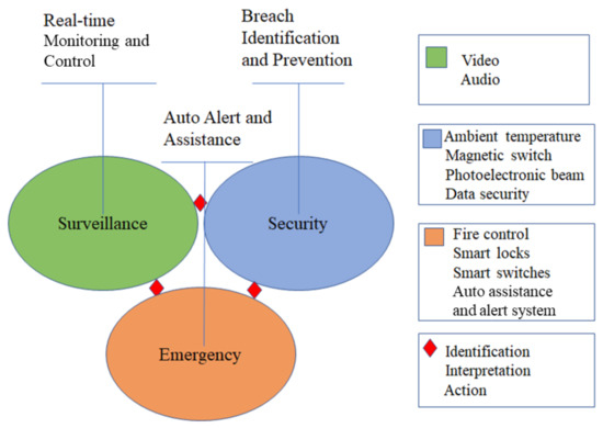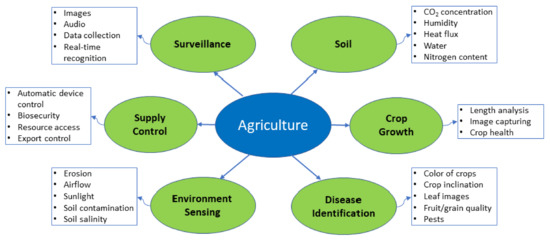 Figure 3. Intelligent Sensing in Agriculture. - Intruder Detection and Surveillance—In IoT devices, attacks and threats have become more dominant as intrusion detection methodologies are hard to deploy. The most effective intrusion detection systems apply signature-matching methods for detecting vicious activities [139]. These systems have low false alarm rates and perform well in the various attacks. Another is anomaly detection; it maps ordinary behaviors to a certain baseline and detects eccentricities. For creating a baseline profile, a supervised learning algorithm is used, which uses previous data samples to train a model. In [140], the knowledge discovery in databases (KDD) is saved to the Oracle database server to extract the proper dataset for a set of classifiers. After preparing the dataset by removing the attacks, the most common experimental techniques are multilayer perception, Bayesian algorithm, and J48 trees for classification. In [141], the dataset from the 1998 DARPA intrusion detection program is pre-processed in binary TCP dump format readable by the neural network. Backpropagation is the supervised learning method used to accomplish this task.An intelligent video surveillance system (IVSS) composed of an IP camera and a human-computer interface is presented in [142]. IVSS has modules for image analysis, image understanding, video capture, and event generation. In the video capture module, input data can be accessed from different IP addresses of cameras over a LAN. Image analysis comprises image processing tasks, for example, extracting relevant information, including tracking, motion detection, etc. Image understanding includes AI techniques to understand the significance of the scene captured by a camera. The abnormal behavior is then forwarded to an event generation module, which helps the user by generating an alarm. The use of intelligent sensing in intrusion detection and remote surveillance for monitoring applications is shown in Figure 4. The use of smart sensors will greatly help improve the existing systems in terms of cost, energy, and performance.