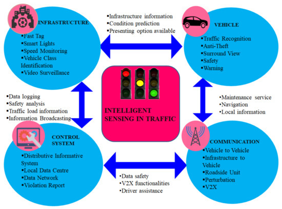 Figure 5. Intelligent Sensing in Traffic Management. - Smart Healthcare—Unsupervised learning algorithms like clustering and principal component analysis (PCA) are used in [145]. In this technique, by maximizing and minimizing the resemblance of patients, the clustering algorithm outputs the labels within the clusters. PCA mainly focuses on reducing the dimension, especially when the features are achieved in a considerable number of dimensions. In [146], SVM is applied to classify imaging biomarkers of nervous and psychiatric diseases. Recently, CNN has been successfully implemented in the healthcare domain through knowledge from ocular images to assist in diagnosing congenital cataract disease [147]. Natural language processing (NLP) aims at better clinical decision making from the narrative text [148]. In [149], NLP is used to read chest X-ray reports to alert physicians to the possible requirement for anti-infective therapy.In healthcare organizations like insurance companies, the use of sensors is to provide accurate and reliable diagnostic results, which can be monitored remotely irrespective of whether the patient is at a clinic, hospital, or home, thereby improving healthcare efficiency. Healthcare management uses intelligent sensing for different purposes, as shown in Figure 6.
