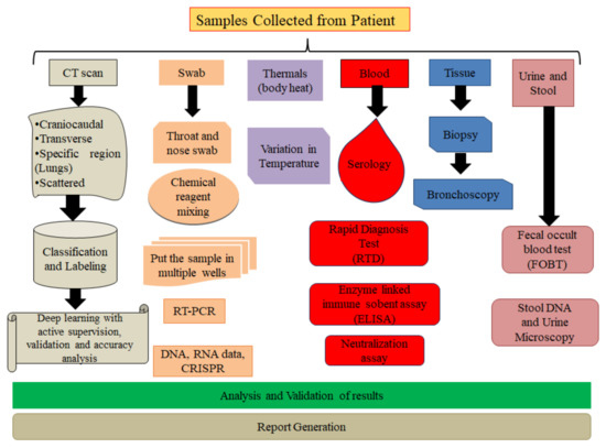 Figure 6. Intelligent Sensing in Healthcare Management.Mass spreading diseases are not rare nowadays; in such cases, fast and reliable information helps to stop the infection to the general public. The mitigation is facilitated by early detection, identification of the cause, and finding a cure. In healthcare, DL and AI have been implemented to control such diseases. Intelligent sensing is also implemented for vaccine detection. In the case of COVID-19, WHO has recommended a swab-based SARS-CoV-2 test. From the swabbed samples, the information related to E-gene from SARS-CoV-2 and gene from enzyme RNA-dependent polymerase, which is in charge of the copying of a DNA sequence into an RNA sequence during the transcription process, plays a key role in the identification of symptoms. Many researchers have observed that real-time PCR methods are also effective for diagnosing the test results [150,151,152]. In these approaches, the protein related to immunological defense is tagged to identify the potential targets using fluorescent tubes. A CRISPR (Clustered Regularly Interspaced Short Palindromic Repeats)-Cas13-based strategy for viral inhibition has been found to be effective for dealing with SARS-CoV-2, which caused COVID-19, and emerging pan-coronavirus pandemic strains [153].Intelligent sensing techniques can be employed to determine the diseases that cause the epidemic and pandemic. In [154], Santosh suggested active learning algorithms with cross-population datasets to test and train models that can compute the data with multiple mini-batches of information to help in detection and decision making. The work presented in [21] proposed an AI-based framework with the use of sensors already mounted on palmtop devices, like smartphones, cameras, inertial, microphone, temperature, and fingerprint sensors to collect information from patients. Deep Learning algorithms are implemented to do the multimodal analysis to detect the presence of COVID-19 symptoms.The use of intelligent sensing with edge computing and cloud services are also encouraging several corporations and startups to work in the area. UNet++ [155] was proposed for medical image segmentation and has been successfully implemented on computed tomography scan, microscopy, and RGB video data. The UNet++ architecture is the new version in the series of U-Net and wide U-Net architecture. It has been observed that with deep supervision, UNet++ has demonstrated better performance than its predecessors. The common issue in implementing the intelligence for disease detection using sensors is that the raw data need to be segmented and labeled for further analysis. In case urgent or fast results are required, a manual method is preferred as in incorporating intelligence to algorithms, training needs to be done by feeding information in significant amounts. If the system is not trained, the accuracy of such a model will be degraded, which will affect the end result, i.e., successful prediction of true positive cases.The nucleic acid test is a method used to identify the cases related to the diagnosis of Gonococcal and other Neisserial infections, HIV RNA, Severe Acute Respiratory Syndrome (SARS), coronaviruses, etc. A recent study shows that it is also being considered for the diagnosis of COVID-19 patients. This test helps detect specific nucleic acid sequences and organisms in blood, tissue, urine, or stool. The work in [156] proposed nucleic acid amplification tests (NAATs) using stacked denoising autoencoders (SDAE) for feature extraction. It is also observed that DeepGene, a cancer type classifier, can be essential [157]. In another work [158], Wang et al. have implemented CNN to recognize the behavior of pulmonary nodules and also to extract features for machine-generated endoscopy images in low light. As observed, artificial intelligence algorithms are increasingly implemented in pathology devices with assistive methods to achieve high accuracy results. In the monitoring of pandemic and epidemic also, such intelligent sensing plays a vital role. Thermography devices can be easily found in public places, especially in the case of mass spreading diseases. Thermal scanner is a commonly known device to identify the fever by interpreting the data (heat map) in human-readable forms.Figure 7 is a case study on the importance of intelligent sensing in epidemic and pandemic. To detect the symptoms related to the infection, multiple tests are proposed, and in most of the cases, a combination of such tests needs to be performed. WHO suggests swab test, which requires the sample collection from nose and throat. On the other hand, in CT scan images are used, and test data need to be further analyzed in thermography to sort out potential patients based on the heat analysis. The tissues collected by biopsy and bronchoscopy are examined to understand the symptoms. Urine and stool tests have also shown the presence of infection in patients. In the case of COVID-19, urine samples are not adequate, and stool analysis has helped detect the presence of infection, similar to SARS and MERS. Blood tests will help analyze cell culture, and multiple serology assays will help identify the virus growth and immune system status. Tests such as RDT, ELISA, and Neutralization assay indicate the presence of antibodies with the possibility of protection against infection. Data from multiple test sources shown in Figure 8 are helpful for training and testing algorithms. Deep learning and artificial intelligence algorithms trained with such data will further help in symptom identification.