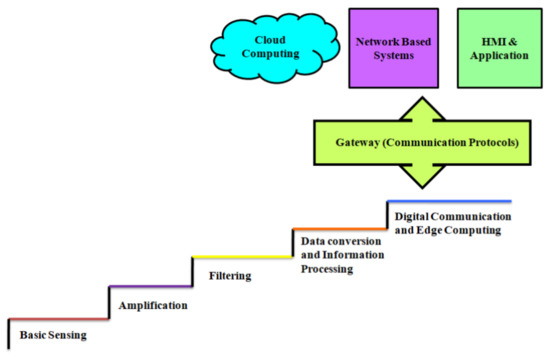 A smart sensor is a sensor that can detect an object’s information, and can learn, judge, and process the data in the form of signals. It can calibrate automatically, collect data, and compensate it. In the 1980s, the effort was focused on integrating computer memory, signal processing circuit, interface circuit, and a microprocessor to one chip so that the sensor can achieve certain AI capability [39]. Smart sensors have emerged due to technological demands and feasibility [40]. The primary source is the sensing element, which can trigger the sensing component to deliver a self-test facility. For this, a reference voltage is applied to monitor the response of the sensor. Amplification is necessary, as most of the sensors produce signals that are lower than signal levels of a digital processor. For example, a piezoelectric sensor requires charge amplification, while resistive sensors need instrumentation amplification. Analog filtering is used to block the aliasing effect in the data conversion stage.