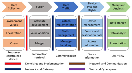It is very important to identify data anomalies as data sometimes are collected from multiple platforms. In such cases, the source of data needs to be tracked for threat and irregularity. The work presented in [104] proposed scheduling and anomaly handling mechanisms in cross-platform IoT systems using cognitive tokens. The proposed methods use intelligent sensing with fair play and exponential growth procedures. In contrast to current technology trends in full-stack system development, a layered architecture-based approach was proposed in [105]. The proposed method will help to collect data, extract useful information, and transfer it for further processing. In the case of more sensitive data sensing, such as clinical or eHealth, Ref. [106] presented the implementation of gateway and scoring mechanisms to reduce the latency and to analyze the performance of systems. Such implementations have shown good performance in fog computing environments, where restricted resources are available at local nodes. The work presented in [107] shows the importance and challenges of IoT-based healthcare information sensing. The work presents challenges related to information acquisition, sensing, storage, processing, analytics, and presentation.