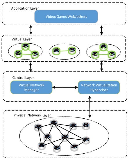 Network virtualization (NV) is a key technology for future networks, which allows telecommunication service providers (TSPs) to share their virtualized network resources with their users in a flexible manner []. It is difficult for traditional network architectures to deploy NV technology due to their rigid structures and complicated service management mechanisms. Software-defined network (SDN) is a new network architecture, which separates the control plane and the data plane of network elements. NV decouples software-based virtual networks from hardware-based physical networks, so it is much easier to be implemented in SDN []. The combination of SDN and NV technology is considered as an effective way to overcome current network ossification and to promote future network innovation. Therefore, SDN-based network virtualization architecture has become a new research topic for scholars. Figure 1 shows an SDN-based NV architecture, which is proposed by Chai et al. [].