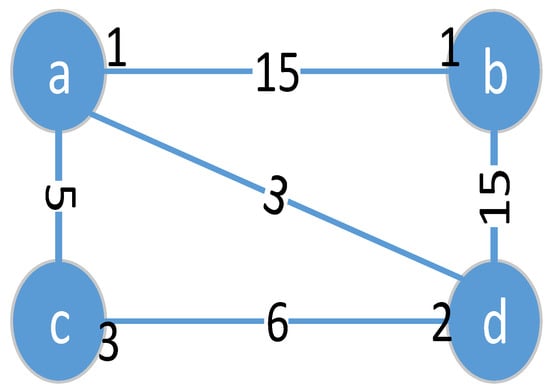 For ease of understanding, we take an example to illustrate virtual node-ranking process. We set the values of the parameter to 0.1. The VN in Figure 3 has four virtual nodes, their Connection-Bandwidth are 23, 30, 11, and 24, respectively, and their security-level are 1, 1, 3, and 2, respectively. Hence, we can obtain their node-ranking values NRV as: 23.1, 30.1, 11.3, and 24.2, respectively. Thus, virtual node b is selected as the first embedding node, and it is put into Nr. We can calculate Connection-Bandwidth of a, c, and d, which are 15, 0, and 15 based on Formula 18; and, they obtain their node-ranking values as: 15.1, 0.3, and 15.2. Thus, virtual node d is selected as the second embedding node, and it is put into Nr. At this time, Nr includes nodes b and d. We can get the Connection-Bandwidths of a and c to be 18 and 6, and the node-ranking values NRV as: 18.1 and 6.3. Therefore, virtual node a is selected as the third embedding node, and d is the last mapping node.
