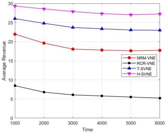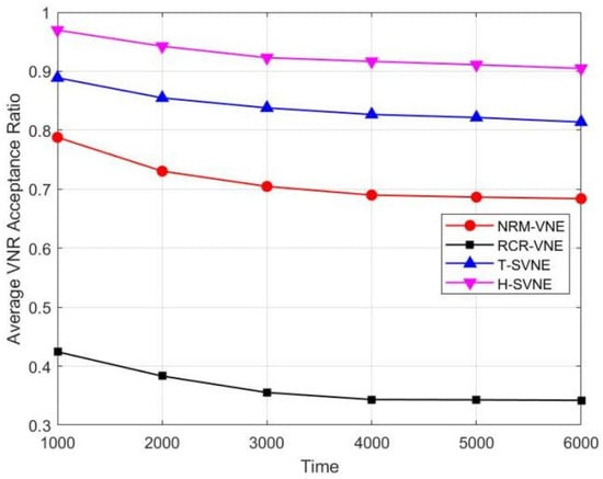 The main simulation results are presented in this subsection. Algorithms are tested based on the above simulation environment. Figure 4 presents the average acceptance ratio as a function of time. Observed from Figure 4, the curves of all algorithms decay with the variation of time. This decay shows that there are no infinite substrate resources to receive more and more VNRs. Our proposed algorithms perform better than other algorithms; it is owing to the fact that our algorithms embed virtual nodes to the physical nodes with smaller Bandwidth-Distance, which is beneficial for saving bandwidth resources. In addition, H-SVNE has a higher acceptance rate than T-SVNE; it is owing to that H-SVNE adopts the traversal strategy to find the physical nodes with the least bandwidth consumption as the destination nodes, while the T-SVNE algorithm adopts the Dhop calculated in advance to replace the number of hops in the shortest path. Therefore, the accuracy of Dhop is not high, which affects the quality of the VNE solution.