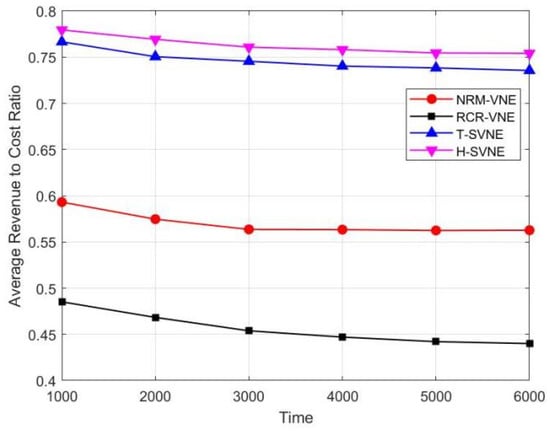 Figure 6 illustrates the average revenue to cost ratio as a function of time. As observed in Figure 6, the average revenue to cost ratio of all algorithms decreases over time. It is owing to the fact that the bandwidth resources of the links are fragmented as the VNE progresses; and virtual nodes are embedded onto physical nodes with larger Bandwidth-Distance. Our proposed algorithms perform better than other algorithms. This is due to two reasons: (1) our algorithms embed virtual nodes to the physical nodes with smaller Bandwidth-Distance; (2) our proposed algorithms embed virtual nodes to physical nodes with lower security-level, which are beneficial for reducing embedding costs.