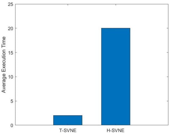 Figure 7 shows the average execution time to process a VNR. From Figure 7, we can observe that the average execution time of the H-SVNE algorithm is much longer than the execution time of the T-SVNE algorithm. It is owing to the fact that the H-SVNE algorithm takes longer to traverse the shortest path of all physical nodes. Compared with T-SVNE, H-SVNE performs better in terms of average acceptance ratio, average revenue, and average revenue to cost ratio; however, H-SVNE takes more execution time to process a VNR. Hence, both algorithms have their own advantages and disadvantages.