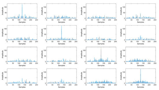 As shown in Figure 3, the sequence with the largest amplitude can be found by correlating , and the correlation result of ( [1, 2..., Q]) is shown. It was also possible to check how much cyclic shift there was by correlating in the same symbol. Each chip contains approximately 78 samples, as previously stated. The desired value of can be calculated because the minimum distance is determined when transmitting. The peak-to-peak distance in Figure 3 differs by 1186 samples. Each chip has 78 samples and the cyclic shift is as much as the product of the minimum distance and bit information . As a result, 1186 divided by 78 equals .