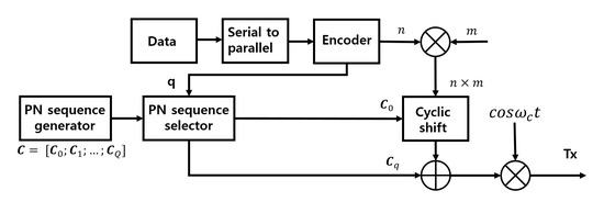where denotes the identity matrix and is the length of the PN sequence. As shown in Figure 2, cyclically shifted and noncyclically shifted are combined to form one symbol, where [1, 2..., ]. represents M bits of information and represents N bits of information. In the i-th symbol , M bits indicated by are , and N bits indicated by n are . As a result, the i-th symbol represents (M+N) bit information. The symbol can be expressed as: