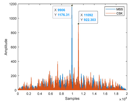 Signals such as Equation (11) are generated to determine the sequence with the highest peak through MSS, and Equation (12) can be written as a reference signal to find the difference between the peaks of CSK as follows: