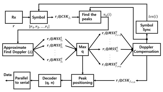 This paper proposes an M-ary cyclic spread spectrum (MCSS) method that combines MSS and MCSK. The MSS method has the advantage of tracking Doppler per symbol [22], and the CSK method has an advantage in the underwater communication channel with a short coherence time by transmitting more information in one symbol [18,19,23]. An MSS system-based receiver processing method for tracking the Doppler factor for each symbol as well as a method for reducing the amount of computation are presented. Because using a Doppler bank requires a significant amount of computation, the maximum range of Doppler is calculated using the peak position of the MSS correlation characteristic and CSK’s shifted correlation characteristic to save computation time and improve accuracy. We recommend employing a Doppler bank within the maximum range of the Doppler to compensate for detailed Doppler. An artificial Doppler shift was generated, and a simulation was implemented to compare the performance. The doppler frequency was estimated in the passband per symbol for MSS and MCSS signals. In the case of the CSK and MCSK signals, the Doppler frequency was measured at the preamble part and then the phase was compensated in the baseband using a phase-locked loop (PLL) [24].