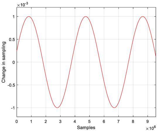 In Figure 8, the Doppler effect was created by arbitrarily changing the sampling rate in the time domain, and the rate of change in the form of a sine graph was created to confirm both positive and negative Doppler. The value of varies depending on how much the sampling changes. That is, the Doppler shifts in response to the gradient change. Figure 9 shows the Doppler factor (), which can be expressed by the following equation: