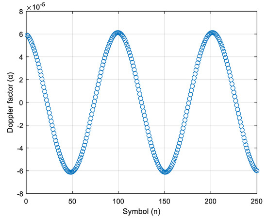 where is the received signal and can be expressed as the sum of each symbol. is the Doppler scale, which is defined as the ratio of the relative velocity between the source and receiver to the propagation wave velocity. The received signal with a Doppler scale () is equivalent to a scaling of the sampling period in a discrete-time processing system with interpolation.
