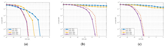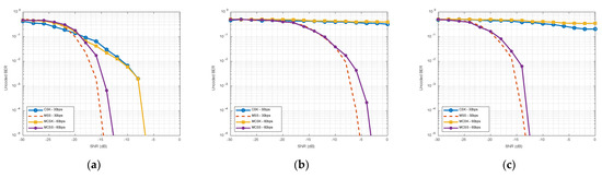 Figure 10a is the result of BER per channel SNR to which only CIR (Figure 7) is applied, and Figure 10b is the result of BER per channel SNR to which only CIR (Figure 7) is applied. Figure 10b shows the results of BER per SNR in the channels added to CIR in Figure 7 and Doppler in Figure 8 without correcting for Doppler, and Figure 10c shows the results of compensating Doppler for each symbol in the channels added to CIR and Doppler. Figure 11 shows the results of comparing the same bit rates. To make the bit rate the same, the symbol rate of MCSK and our proposed MCSS is halved and the number of sequences is doubled to have the same bandwidth. Only CIR is used in Figure 10a and Figure 11a, and the outcome is a performance comparison for orthogonality of signals. At the same symbol rate, MSS was the best, followed by MCSS, MCSK, and CSK. MCSK performed better than CSK at the same bit rate. The results without Doppler compensation in the channel with CIR and Doppler added are shown in Figure 10b and Figure 11b. MSS has the best performance when the symbol rate is the same, followed by MCSS. By superimposing two separate sequences, our proposed MCSS signal contains more information in a single symbol. At the same symbol rate, the two distinct sequences acted as noise to each other, resulting in somewhat worse performance than MSS. Our proposed MCSS, on the other hand, performed better at the same bit rate. Even when the SNR was 0 dB, the BER of the CSK and MCSK signals was measured to be 0.3 or higher, and the result was very sensitive to Doppler. CSK and MCSK demodulate at the baseband, so phase variation is included in the desreading process, resulting in poor BER performance. However, MSS and MCSS show more robust results because Doppler frequency correction in passband is included. The results of Doppler compensation in the channel to which CIR and Doppler are added are shown in Figure 10c and Figure 11c. The MSS and MCSS data exhibit similar tendencies to those without Doppler adjustment; however, they perform much better at lower SNRs. In CSK and MCSK, Doppler is compensated for the first symbol using the preamble, and phase is compensated using the PLL.