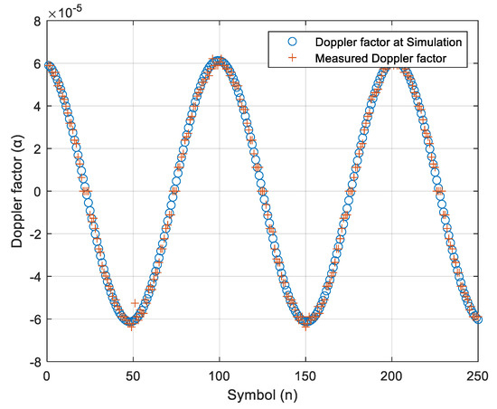 Figure 12 shows measured using the Doppler bank, and Figure 13 shows the change of one symbol length according to . It was demonstrated that the change in the time axis utilized in the simulation and the change in the symbol length by the measured produced the same outcome. As previously stated, the present Doppler bank detects Doppler in the −21.4 Hz to 21.4 Hz range. However, our proposed method uses the peak-to-peak distance to obtain the approximate Doppler () and the Doppler bank to find the precise within the approximate Doppler error range.