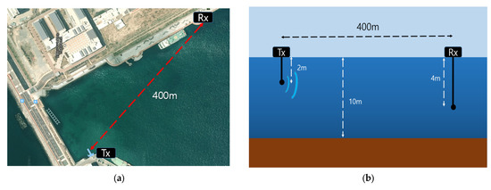 Figure 14 shows a diagram of the experimental equipment configuration. This experiment was carried out off the coast of the Korea Maritime and Ocean University. Table 3 shows parameters for sea trials. The range between the transmitter and receiver was 400 m and the sea depth was approximately 10 m. The transmitter was at a depth of 2 m, whereas the receiver was at a depth of 4 m. A transmitter, the ITC-3013 [29], offers highly efficient broadband transmission with a hemispherical beam pattern.