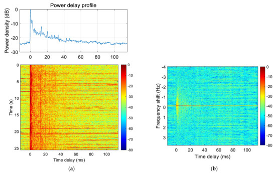 (a) Measured channel impulse response. (upper panel) A linear plot of the impulse-response function, (b) Delay-Doppler spread function.