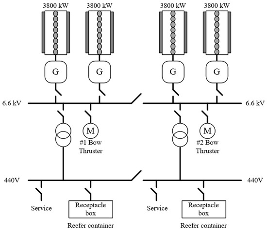 The subject ship of the present study is a super-large container ship with a size of 13,154 TEU (twenty-foot equivalent unit). The ship can load 1200 FEU (forty-foot equivalent unit) refrigerated containers and consumes approximately 7440 kW of power when operated at the maximum load. Figure 1 shows the power system of the target ship, and Table 1 lists the specifications of the ship.