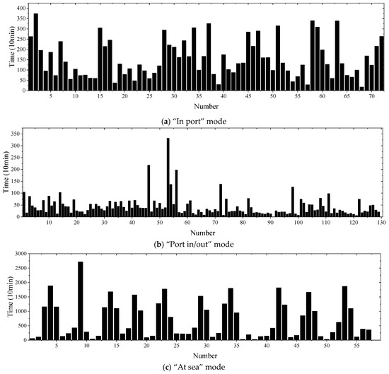 The ship’s operation mode follows the order of “In port”, “Port in/out”, “At sea”, and “Port in/out”. When “Port in/out” occurs after “In port”, the operation is expressed as “Departure”, and before “Port in/out”, “In port” is expressed as “Arrival”. “At sea mode” occurs after the ship loads cargo from a port and travels to a target port. It operates at a relatively constant speed and takes up most of the voyage time. The power consumption is constant, and the load fluctuation is low. “Port in/out” mode is a process for a ship to anchor in a port at sea, and the speed change is large as the propulsion engine is operated at maneuvering rpm. It consumes the lowest time of operation, and the magnitude and volatility of power consumption are high. In “In port” mode, the propulsion engine is not used. It consumes the lowest load, and the load variability is also low. Figure 2 shows the operating time in each mode.