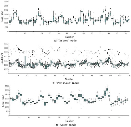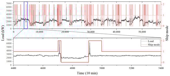 Figure 3 shows the change in the load and operation mode of the ship according to the time the data were acquired, “0, 1, and 2 modes of the ship” indicate “In port”, “At sea”, and “Port in/out” modes, respectively.