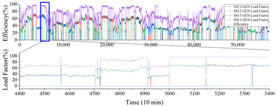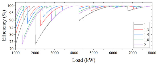 It can be seen that the efficiency is as high as 97.7–98.2% when the value of is in the range of 1.3–1.8. Moreover, when the value of is 1.5, the operation combination of the generator is evenly utilized for the required load for it to respond efficiently. Table 3 shows the efficiency of each as quartiles.